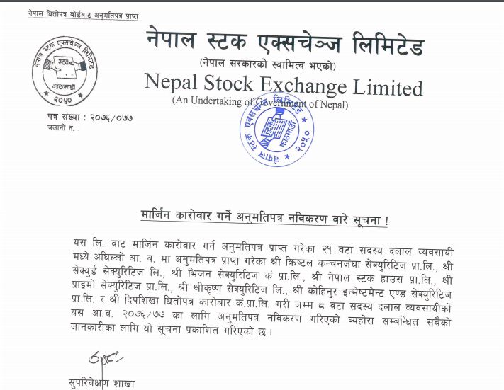 मार्जिन कारोबार गर्न ब्रोकर कम्पनीहरुले प्रत्येक वर्ष सदस्यता नवीकरण गर्नुपर्ने हुन्छ । नेप्सेका अनुसार अघिल्लो वर्ष २१ वटा कम्पनीले यो सेवा लिन अनुमति पाएका थिए । त्यसमध्ये ८ वटा व्यवसायीले आर्थिक वर्ष २०७६–७७ का लागि नवीकरण गरेको नेप्सेले जनाएको छ ।