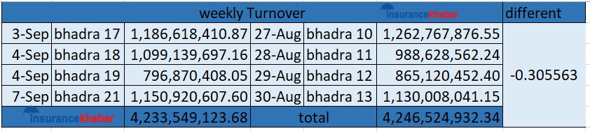 अघिल्लो साता ४ अर्ब २४ करोड ६५ लाख २४ हजार रुपैयाँ कारोबार भएको थियो । यस साता ४ अर्ब २३ करोड ३५ लाख ४९ हजार रुपैयाँको कारोबार भएको छ । अघिल्लो साताको तुलनामा कुल कारोबार रकम सामान्य प्रतिशतले घटेको हो ।