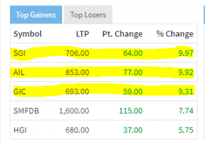 मंगलबार सानिमा जनरल इन्स्योरेन्स कम्पनीको शेयर मूल्य ९.९७ प्रतिशलते बढेर ७०६ रुपैयाँ कायम भएको छ । त्यस्तै अजोड इन्स्योरेन्सको ९.९२ प्रतिशतले बढेर ८५३ रुपैयाँ पुगेको छ भने जनरल इन्स्योरेन्स कम्पनीको ९.३१ प्रतिशतले बढेर ६९३ रुपैयाँ पुगेको छ ।