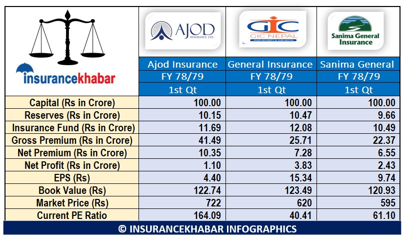 कम्पनीहरुले प्रकाशन गरेको आर्थिक वर्ष ७८/७९ को प्रथम त्रैमासको वित्तीय विवरणको आधारमा अजोड इन्स्योरेन्सले १० करोड ३५ लाख खुद बीमा शुल्क आर्जन गरेको छ भने जनरल इन्स्योरेन्सले ७ करोड २८ लाख खुद बीमा शुल्क आर्जन गरको छ र सानिमा जनरल इन्स्योरेन्सले ६ करोड ५५ लाख खुद बीमा शुल्क आर्जन गरको छ ।