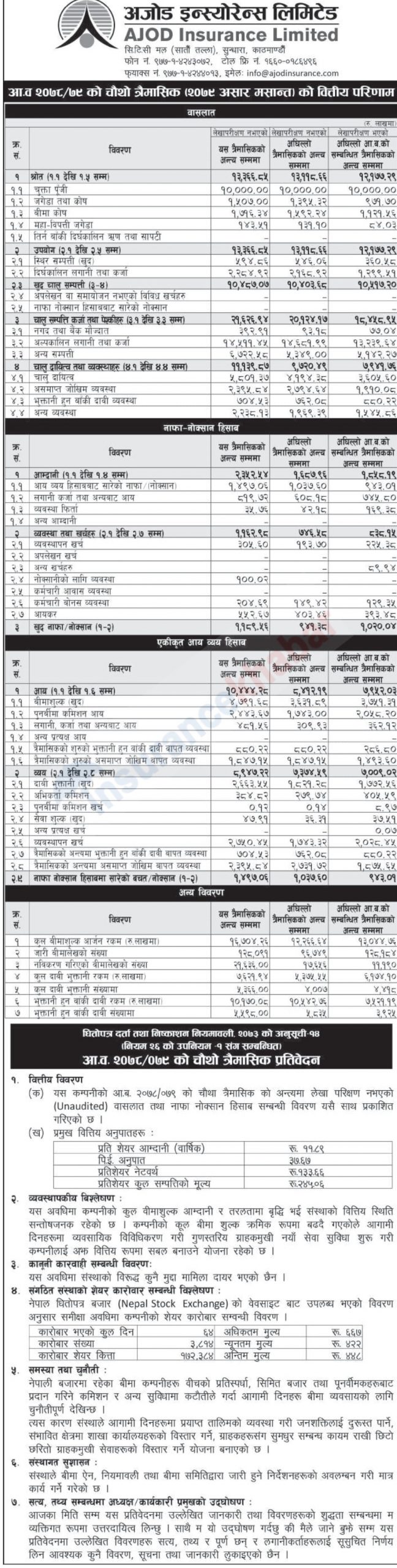 अजोड इन्स्योरेन्सको नाफा १६ प्रतिशतले बढ्यो, कुल बीमा शुल्क आर्जन १ अर्ब ६७ करोडमाथि (रिपोर्ट सहित)