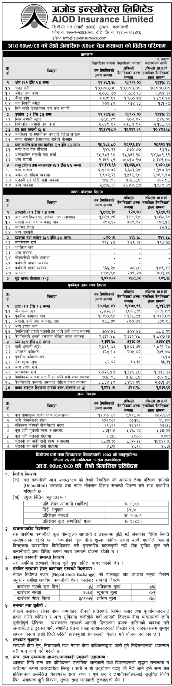 काठमाडौं । अजोड इन्स्योरेन्सले चालु आर्थिक वर्षको तेश्रो त्रैमासिक वित्तीय विवरण सार्वजनिक गरेको छ। सार्वजनिक गरिएको तथ्यांक अनुसार कम्पनीले १० करोड ४७ लाख खुद नाफा गरेको छ । गत आर्थिक वर्षको तेश्रो त्रैमाससम्म सो नाफा ९ करोड ४१ लाख थियो । नाफा यो अवधिमा ११ प्रतिशतले बढेको छ ।