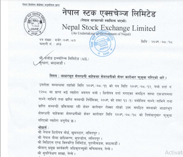 काठमाडौं । नेपाल स्टक एक्सचेञ्जले अजोड इन्स्योरेन्सको शेयर कारोबार फुकुवा गरेको छ । यस कम्पनीको आधारभुत शेयरधनी बाहेक अन्य शेयर कारोबार फुकुवा गरेको हो ।