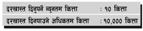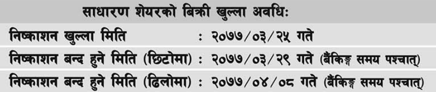 उक्त कम्पनीको आईपीओ खरीद गर्न चाहनेले न्युनतम १० कित्तादेखि अधिकतम १० हजार कित्तासम्म आवेदन दिन सक्नेछन् । आईपीओ असार २५ गते देखि असार २९ गते सम्म खुल्ने छ । असार २९ गते बैंकिङ्ग समय पश्चात आवेदन दिन सकिने छैन । यदि असार २९ गते सम्मपनि सम्पूर्ण शेयर कित्तामा आवेदन नपरेको अवस्थामा श्रावण ८ गते सम्म समय थपिने छ । कम्पनीको विक्री प्रवन्धकमा एनआईबिएल एस क्यापिटल रहेको छ ।