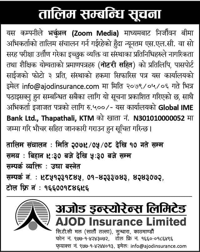 कम्पनीले उक्त तालिम भर्चुुअल माध्यमबाट संचालन गर्न लागेको जनाएको छ । ईच्छुक व्यक्तिले ५ सय रुपैयाँ कार्यालयको ग्लोबल आइएमई बैंकको खाता नम्बरमा जम्मा गर्न आग्रह गरेको छ । तालिम बिहान ९ः३० बजेदेखि साझ ५ः३० बजेसम्म संचालन गर्नेछ ।