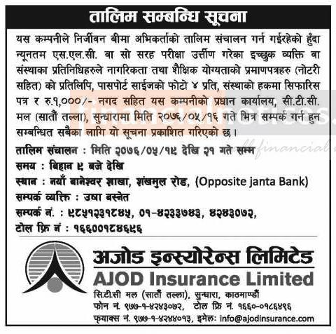 एसएलसी वा सो सरह परीक्षा उत्तिर्ण गरेका बीमा अभिकर्ता बन्न इच्छुक व्यक्तिहरु तालिममा सहभागी हुन सक्नेछन् । कम्पनीले नयाँ बानेश्वर शाखा कार्यालयमा तालिम सञ्चालन गर्न लागेको हो ।