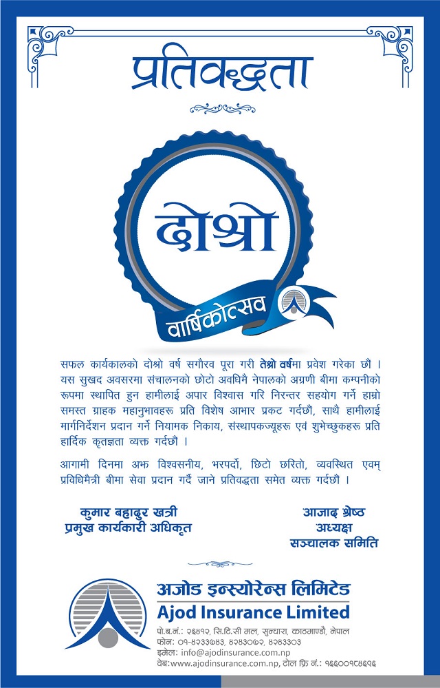 अजोड इन्स्योरेन्स तेस्रो वर्षमा, महामारीमा राहत दिँदै बीमा सेवा प्रवाह गर्ने प्रतिबद्धता