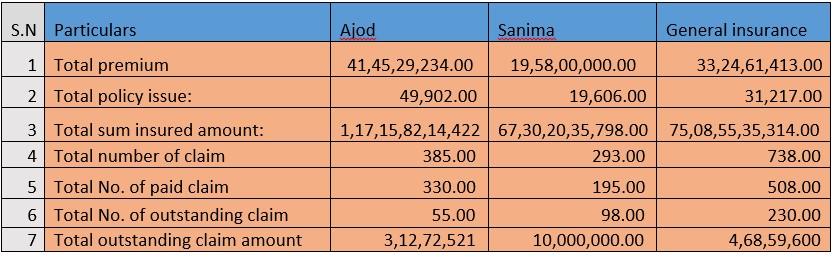 अजोड इन्स्योरेन्स कम्पनी र सानिमा जनरल इन्स्योरेन्स कम्पनीको तथ्याङ्कहरु बीमा कारोबारको आधारमा धेरै हदसम्म समानता देखिए पनि जनरल इन्स्योरेन्स कम्पनीको तथ्याङ्कमा भने ठीक विपरित नकारात्मक देखिएको छ । कूल ४९ हजार ९०२ वटा पोलिसी बिक्री गरी एक खर्ब १७ अर्ब १५ करोड ८२ लाख १४ हजार ४२२ रुपैयाँको को जोखिम बहन गरेको अजोड इन्स्योरेन्सले जम्मा ७३८ वटा बीमा दावीको सामना गर्नु परेको छ । सो मध्ये ५०८ वटा बीमा दावी भुक्तानी गरिसकेको देखिन्छ ।