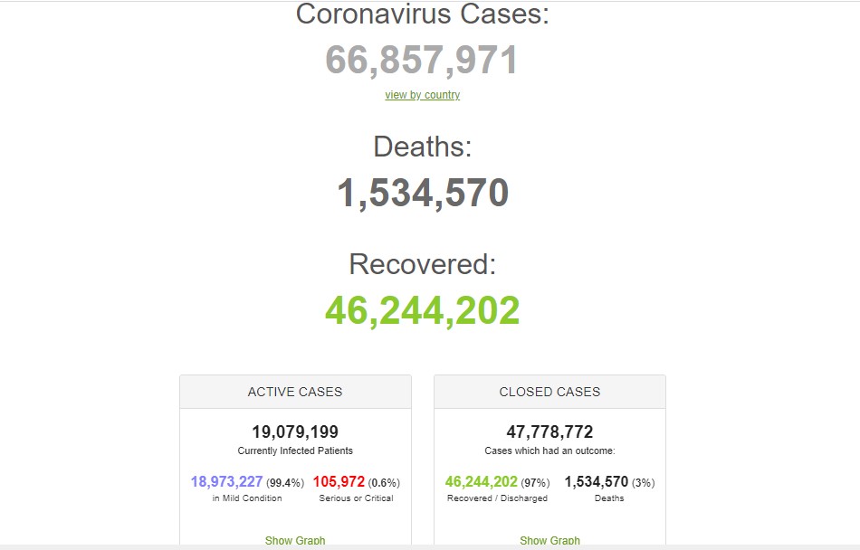 पछिल्लो तथ्याङ्क अनुसार कोरोना भाइरसबाट विश्वभर छ करोड ६८ लाख ६७ हजार ९७१ जनामा संक्रमित देखिएको छ । हालसम्म १५ लाख ३४ हजार ५७० जनाको मृत्युको कारण जेसुकै भएपनि कोरोना परिक्षणमा पोजेटिभ नतिजा देखिएको छ । कूल सात अर्ब जनसंख्या रहेको विश्वमा कूल जनसंख्याको एक प्रतिशत जनसंख्यामा कोरोना भाइरसको संक्रमण देखिएको छ । त्यस्तै, विश्वभर हालसम्म चार करोड ६२ लाख ४४ हजार २०२ जना कोरोना भाइरसलाई जितेर निको भइसकेका छन् । यद्यपि विश्वभर अझै पनि एक करोड ९० लाख ७९ हजार १९९ जना अझै पनि कोरोना भाइरससँग लडिरहेका छन् ।