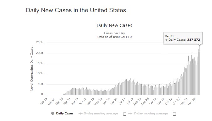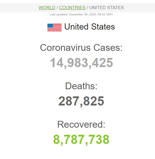 तथ्याङ्क अनुुसार अमेरिकामा दैनिक दुई लाख भन्दा बढि मानिसहरु नयाँ संक्रमित थपिइरहेका छन् भने दैनिक एक लाख मानिसहरु अस्पताल भर्ना भइरहेका छन् । अमेरिकामा दैनिक मृत्युदर दुई हजार दुई सयदेखि तीन हजार जनासम्मको मृत्यु भइरहेको छ ।