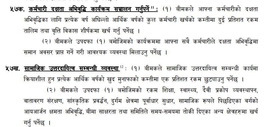 यसैगरी दफा ५७ (ख) बीमकले सामाजिक उत्तरदायीत्व सम्बन्धी कार्यमा कृयाशील हुन प्रत्येक आर्थिक वर्षको खुद मुनाफाको कम्तीमा १ प्रतिशत रकम छुट्याउनुपर्ने प्रावधान छ। यस्तो प्रावधान अन्तर्गत शिक्षा स्वास्थ्य दैवी प्रकोप व्यवस्थापन वातावरण संरक्षण सांस्कृति प्रवर्द्धन दुर्गम क्षेत्रमा पूर्वाधार सुधार सामाजिकरुपले पिछडिएका वर्गको आयआर्जन क्षमता अभिवृद्धि बीमा साक्षरता तथा प्राधिकरणले समय समयमा तोकेका अन्य क्षेत्रमा खर्च गर्नुपर्ने प्रावधान छ।