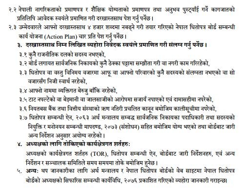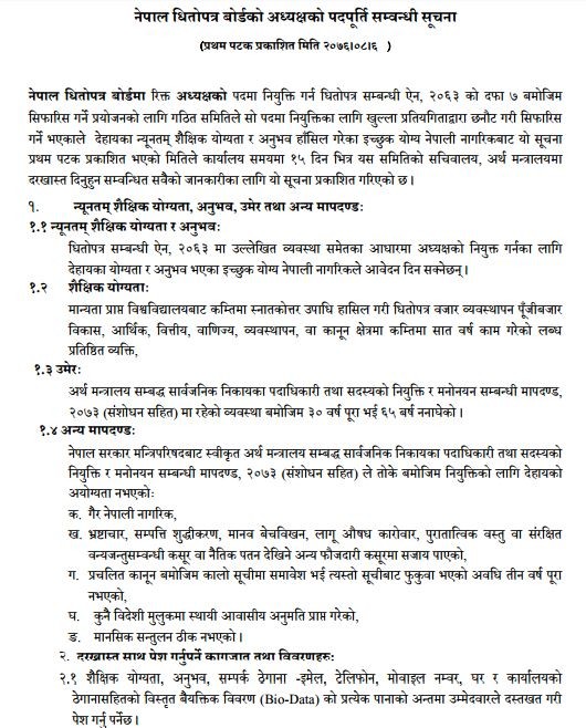 बोर्डले अर्थमन्त्रालय अन्तर्गत रहेको बोर्ड अध्यक्ष सिफारिस गर्ने प्रयोजनार्थ गठित छनौट समितिको सचिवालयमा प्रथमपटक सूचना प्रकाशित भएको मितिले १५ दिन भित्रमा न्यूनतम शैक्षिक योग्यता र अनुभव हाँसिल गरेका इच्छुक नेपाली नागरिकले दरखास्त दिन सक्ने जनाएको छ ।
