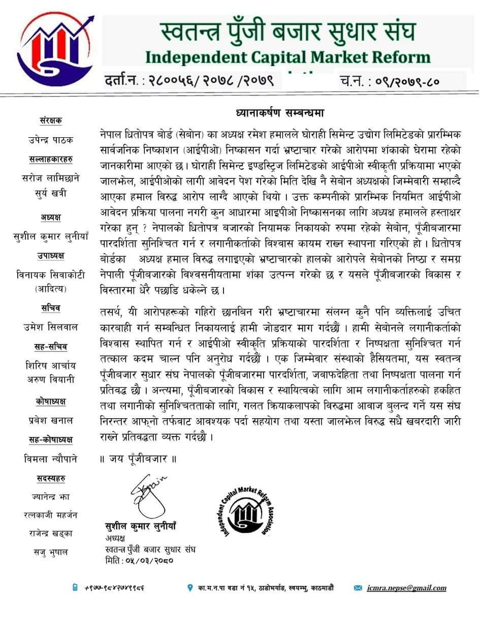 घोराही सिमेन्ट इण्डस्ट्रिजको आइपिओ स्वीकृति प्रक्रियामा भएको जालझेल, आइपिओका लागि आवेदन पेश गरेको मितिदेखि नै सेबोन अध्यक्षको जिम्मेवारी सम्हाल्दै आएका हमाल विरुद्ध आरोप लाग्दै आएको उनिहरुले उल्लेख गरेका छन् ।