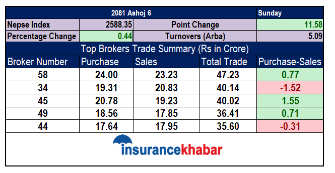 काठमाडौं । असोज ६ गते आइतबार नेप्से परिसूचक २५८८.३५ विन्दुमा पुगेर बन्द भएको छ । यस दिन परिसूचक ११.५८ अंकले बढेको छ।५ अर्ब ९ करोड कारोबार भएको दिन ब्रोकर नम्बर ५८ बाट सर्वाधिक रकमको कारोबार भएको छ । ब्रोकर नम्बर ५८ बाट ४७ करोड २३ लाखको कारोबार भएको छ जसमा २४ करोडको खरिद छ भने २३ करोड २३ लाखको बिक्री छ ।