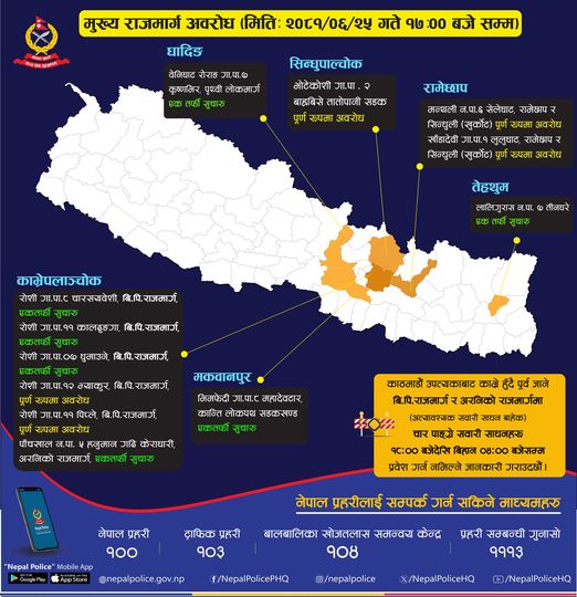 यसैगरी काभ्रेको रोशी गाउँपालिका ८ चारसयवेशी, वडा नम्बर ११ कालढुङ्गामा र वडा नम्बर ७ को घुमाउनेमा एकतर्फीरूपमा यातायात खुलाइएको छ। राेशी गापाको वडा नम्बर १२ भ्याकुर, ११ नम्बर पिप्लेमा सडक पूर्णरूपमा अवरूद्ध रहेको छ। काभ्रेको पाँचखाल नपा ५ हनुमान गढी केराघारीमा राजमार्ग एकतर्फीरूपमा खुलाइएको छ।