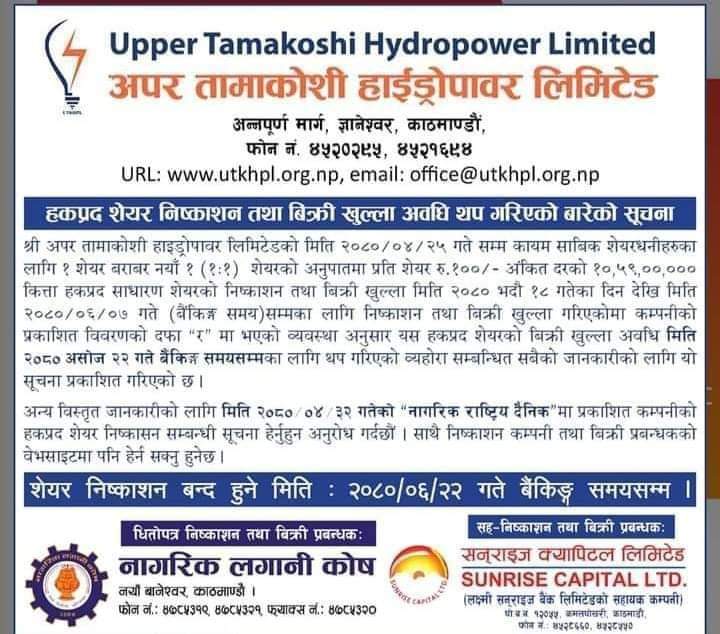 काठमाडौं । अपर तामाकोशी हाइड्रोपावर लिमिटेडको हकप्रद शेयरमा आवेदन दिने म्याद थप भएको छ । यसअघि आवेदन दिने अन्तिम दिन असोज ७ गते भनेकोमा अब म्याद थप भएसँगै असोज २२ गतेसम्म आवेदन दिन सकिने भएको हो ।