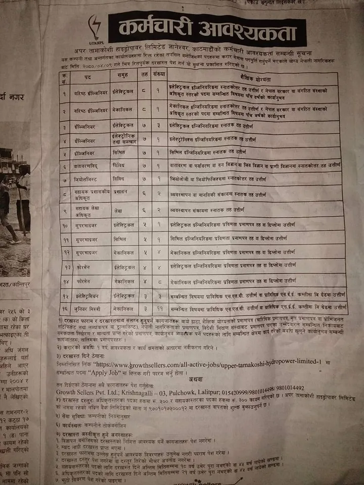 त्यस्तै, कम्पनीले सहायक प्रशासकीय अधिकृत २ जना, सहायक लेखा अधिकृतमा २ जना, इलेक्ट्रिकल र सिभिल सुपरभाइजर १र१ जना, मेकानिकल सुपरभाइजर ४ जना, इलेक्ट्रिकल फोरमेन ८ जना, इलेक्ट्रिसियन ३ जना र मेकानिमल जुनियर मिस्त्रीमा ११ जना कर्मचारी माग गरेको हो ।