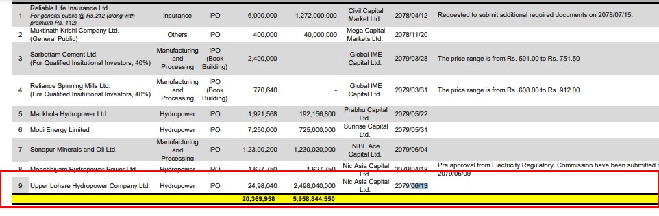 काठमाडौं । अपर लोहोरे हाइड्रोपावर कम्पनीले आइपीओ निष्काशनको अनुमति माग गरेको छ । कम्पनीले आइपीओ निष्काशनको लागि असोज १३ गते बोर्डमा आवेदन दिएको हो ।