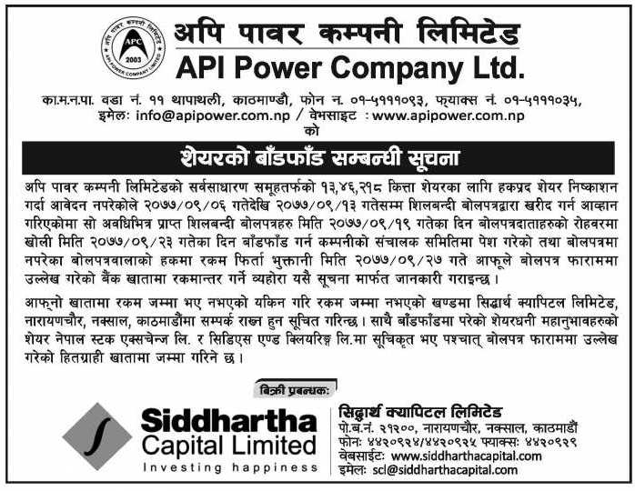 बोलपत्रमा नपरेका बोलपत्रवालाहरुलाई बोलपत्र फाराममा उल्लेख गरेको बैंक खातामा पौष २७ गते, सोमबारबाट रकमान्तर गरिने पनि कम्पनीले जानकारी दिएको छ । आफ्नो खातामा रकम जम्मा भए नभएको यकिन गरी रकम जम्मा नभएको खण्डमा सिद्धार्थ क्यापिटल लिमिटेड नारायनचौर, नक्साल, काठमाडौंमा सम्पर्क राख्न आग्रह गरेको छ ।