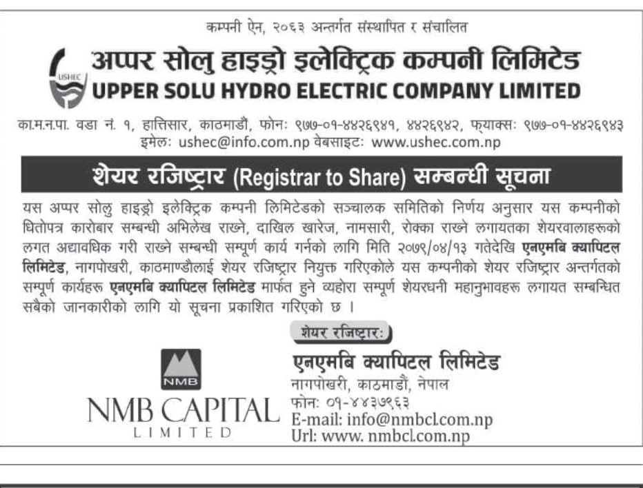 काठमाडौं । अप्पर सोलु हाइड्रो इलेक्ट्रिक कम्पनी लिमिटेडको शेयर रजिष्ट्रारमा एनएमबि क्यापिटल नियुक्त भएको छ । अप्पर सोलु हाइड्रोको सञ्चालक समितिको निर्णय अनुसार क्यापिटललाई साउन १३ गतेदेखि शेयर रजिष्ट्रारमा नियुक्त गरेको जनाएको छ ।