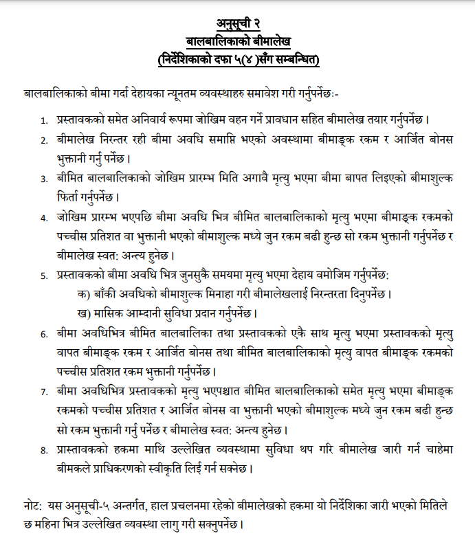 यसैगरी निर्देशिकाकाे दफा ५(४) सँग सम्बन्धित अनुसूची २ मा बालबालिकाकाे बीमालेख सम्बन्धी व्यवस्थाहरूमा बीमा अवधिभित्र जुनसुकै समयमा प्रस्तावककाे मृत्यु भएमा बाँकी अवधिकाे बीमाशुल्क मिनाहा गरी बीमालेखलाई निरन्तरता दिनुपर्ने र मासिक आम्दानी सुविधा प्रदान गर्नुपर्नेछ। बीमा अवधिभित्र प्रस्तावक र बालबालिकाकाे एकैसाथ मृत्यु भएमा प्रस्तावककाे मृत्यु वापत बीमांक र आर्जित बाेनश तथा बालबालिकाकाे मृत्यु भएवापत बीमांककाे २५ प्रतिशत रकम भुक्तानी गर्नुपर्नेछ।