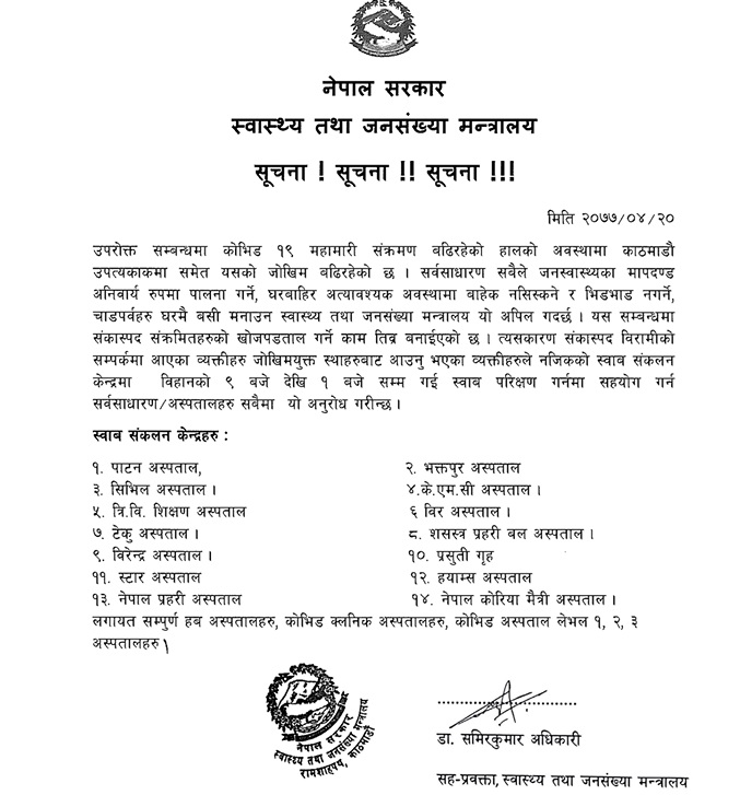 मन्त्रालयले उपत्यकाका विभिन्न १४ वटा अस्पताललाई स्वाब संकलन केन्द्र तोकेको छ । जसमा टिचिङ, प्रसूति गृह, सिभिल, पाटन, टेकु, वीरेन्द्र, स्टार, नेपाल प्रहरी, भक्तपुर, केएमसी, वीर, सशस्त्र प्रहरी, नेपाल कोरिया मैत्री र ह्याम्स अस्पताल तोकिएका छन् ।