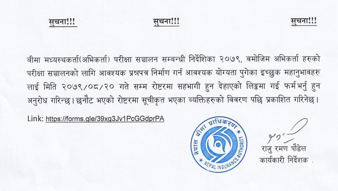 काठमाडौं । नेपाल बीमा प्राधिकरणले बीमा मध्यस्थकर्ता (अभिकर्ता)को परीक्षाको प्रश्नपत्र निर्माणकर्ताहरुलाई रोष्टरमा सहभागी हुन आह्वान गरेको छ । प्राधिकरणले परीक्षा सञ्चालन सम्बन्धी निर्देशिका २०७९ बमोजिम अभिकर्ताहरुको परीक्षा सञ्चालनका लागि आवश्यक प्रश्नपत्र निर्णमा गर्न आवश्यक योग्यता पुगेका इच्छुक व्यक्तिहरुलाई रोस्टरमा सहभागि हुन अनुरोध गरेको हो ।