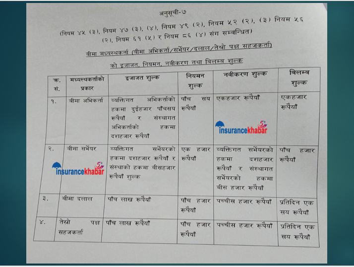 नियमावलीमा मध्यस्थकर्ताको रुपमा बीमा अभिकर्ता, बीमा सर्भेयर, बीमा दलाल र तेस्रो पक्ष सहजकर्ता भनिएको छ । नियमावलीको मस्यौदामा व्यक्तिगत बीमा अभिकर्ताको हकमा दुई हजार पाँचसमय रुपैयाँ र संस्थागत अभिकरत्को हकमा १० हजार रुपैयाँ तोकिएको छ । यस भन्दा अगाडी व्यक्तिगत बीमा अभिकर्ताका लागि इजाजत शुल्क ५०० रुपैयाँ मात्रै थियो । तर हरेक वर्ष नविकरण गर्नु पर्ने व्यवस्था थियो । अहिलेको नयाँ बीमा ऐन २०७९ मा नविकरण तीन/तीन वर्षमा मात्रै गर्नु पर्ने व्यवस्था गरिएको छ । पहिलाको व्यवस्था अनुसार नविकरण शुल्क २०० रुपैयाँ मात्रै थियो ।