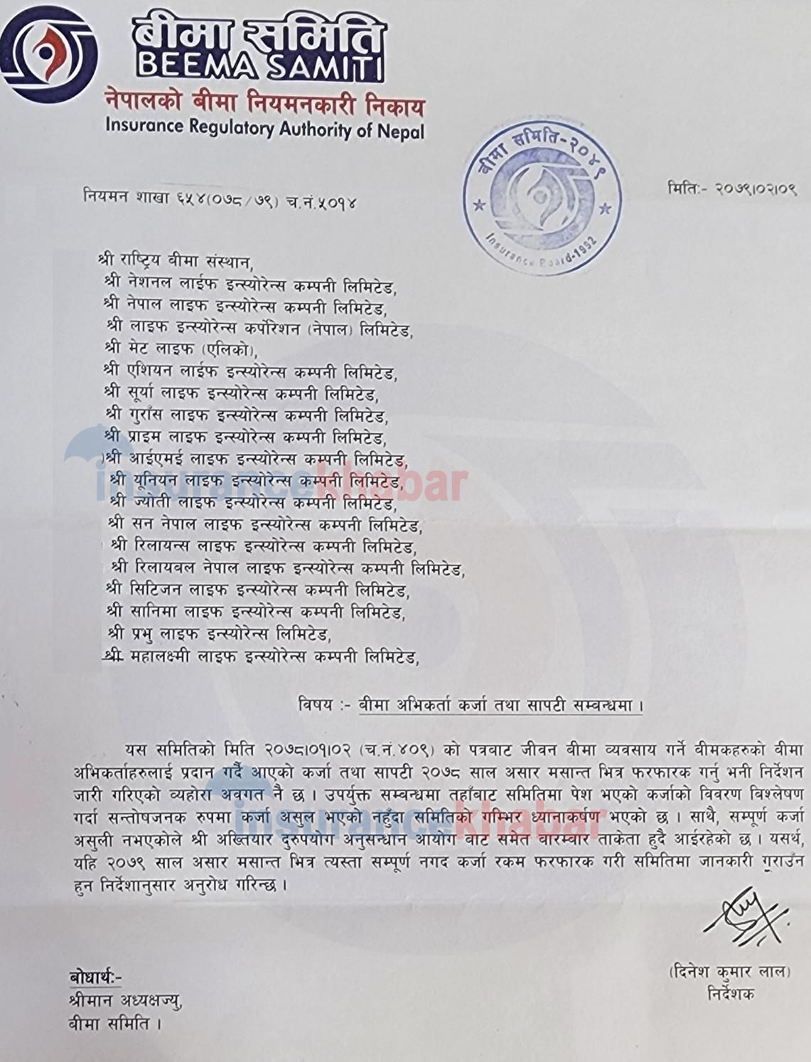 बीमा समितिले पहिलो पटक २०७८ बैशाख २ गते सम्पुर्ण जीवन बीमा कम्पनीहरुलाई पत्र मार्फत अभिकर्ताहरुलाई प्रवाह भएको कर्जा तथा सापटी २०७८ असार मसान्त भित्र फरफार गर्न निर्देशन दिएको थियो । तर अभिकर्ताहरुको चर्को विरोध तथा बीमा कम्पनीहरुको अनुरोधमा बीमा समिति केहि चलक देखिएको थियो ।