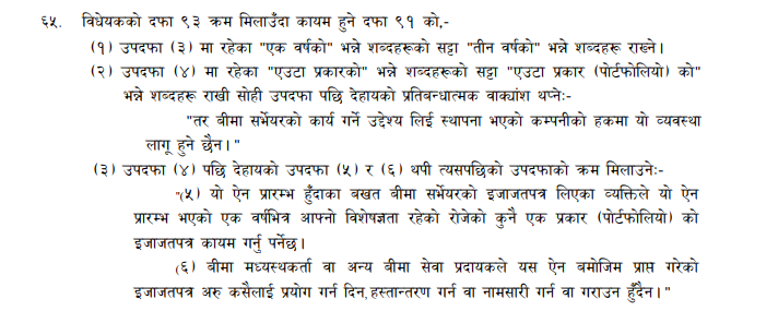 अर्थ समितिले अभिकर्ता तथा मध्यस्थकर्ताको इजाजतपत्रको अवधिलाई भने लम्बाइदिएको छ । अर्थसमितिले दिएको सुझावलाई संसदले स्वीकार गरे सँगै उक्त सुझाव कानुन बनेको हो । जहाँ उपदफा तीन मा रहेको एक वर्षको भन्ने शब्दहरुको सट्टा तीन वर्षको भन्ने शब्दहरु राख्ने भनिएको छ । यो भनेको बीमा मध्यस्तकर्ता तथा अन्य बीमा सेवा प्रदायकको इजाजतपत्रको अवधि एक वर्षबाट तीन वर्ष पुर्याइएको हो । बीमा अभिकर्ता सहित सर्भेयरहरुले समेत अव हरेक वर्ष इजाजतपत्र नविकरण गर्नै पर्ने व्यवस्थाबाट मुक्ति पाएका छन् ।