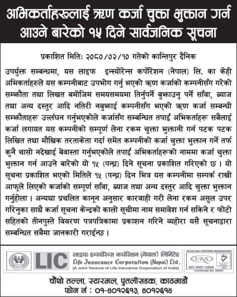 कम्पनीले पटक पटक लिखित तथा मौखिक रुपमा ऋण कर्जा चुक्ता भुक्तान गर्न आग्रह गरेपनि अभिकर्ताहरुले कुनै चासो नदेखाई वेवास्ता गरेका अभिकर्ताहरुलाई सो वापतको रकम भुक्तानी गर्न १५ दिने सुचना जारी गरेको छ । सुचना प्रकाशित भएको मितिले १५ दिनभित्र कम्पनीमा सम्पर्क गरी आफुले लिएको कर्जाको साँवा तथा ब्याज र अन्य दस्तुर तिर्न आग्रह गरेको छ ।