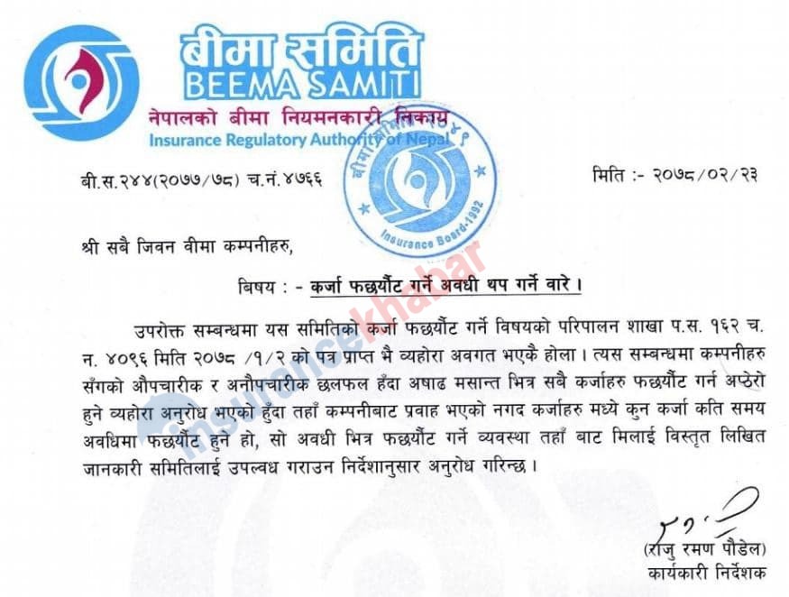 कर्जा असुल फर्छ्यौट गर्ने सम्बन्धमा कम्पनीहरु सँगको औपचारिक र अनौपचारिक छलफल हुँदा अषाढ मसान्तभित्र सबै कर्जाहरु फर्छ्यौट गर्न अप्ठेरो हुने व्यहोरा अनुरोध भए पछि यस्तो निर्देशन जारी गरिएको समितिले जनाएको छ । कम्पनीबाट प्रवाह भएको नगद कर्जाहरु मध्ये कुन कर्जा कति समय अवधिमा फर्छ्यौठ हुने हो, सो अवधि भित्र फर्छ्यौट गर्ने व्यवस्था मिलाउने जानकारी बीमा समितिलाई अवगत गराउनु पर्ने भएको हो ।