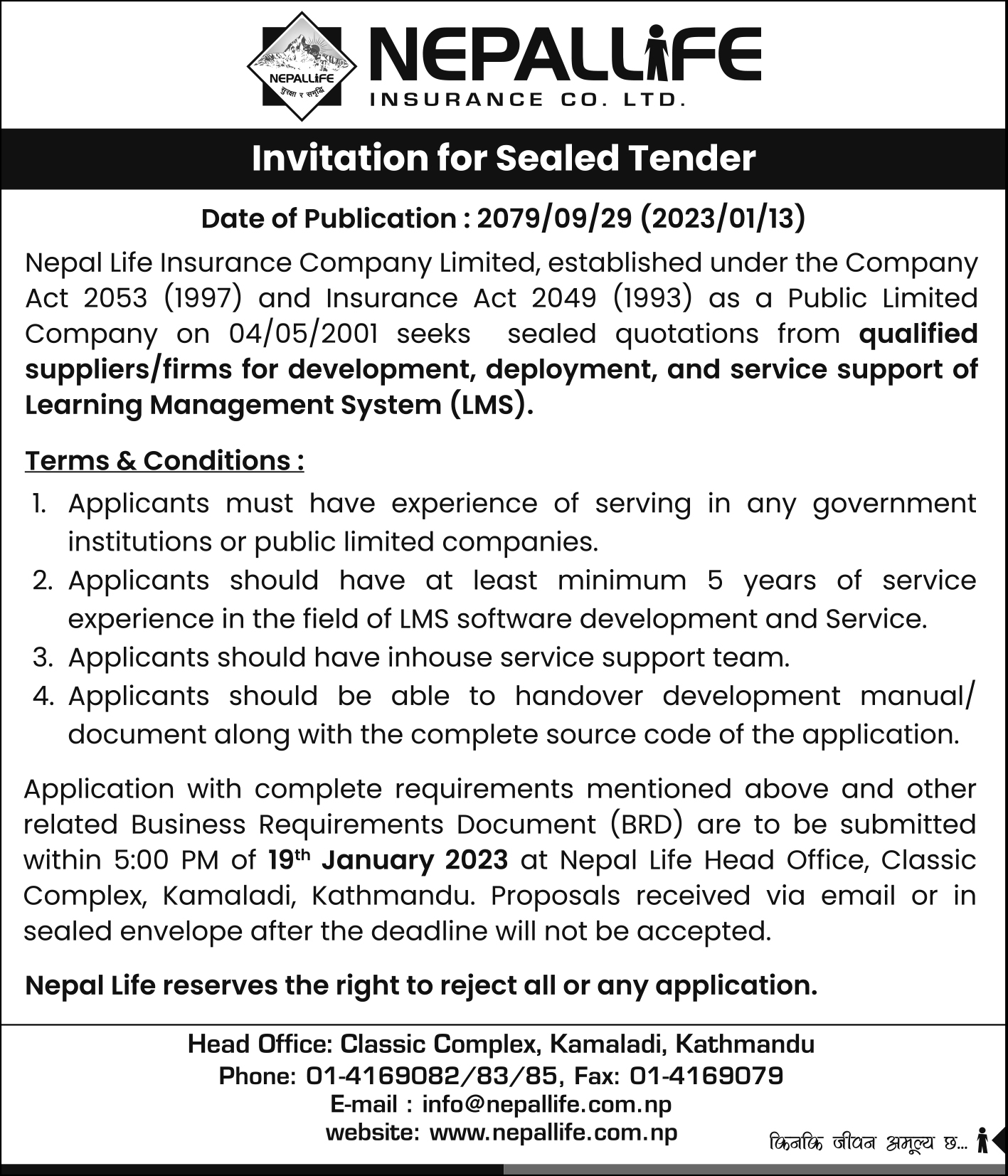 नेपाल लाईफले बीमा अभिकर्ता सम्बन्धी तालिम लिन चाहने र अभिकर्ता पेशा अंगाल्न चाहने आकांक्षीले जुनसुकै बेला जहाँसुकैबाट पनि तालिममा सहभागीता जनाउन सक्ने सुविधा सहितकाे लर्निङ म्यानेजमेन्ट सिस्टम-एलएमएस (सिकाई व्यवस्थापन प्रणाली) प्रयाेगमा ल्याउन लागेकाे हाे । प्रस्तावित सफ्टवेयर प्रणालीमा आवेदक स्वयमले पनि आफ्नाे शैक्षिक, चारित्रिक प्रमाण पत्र, नागरिकता, फाेटाे, स्थायी लेखा नम्बर प्रमाण पत्रलगायतकाे दस्तावेज प्रविष्ट गर्न सक्ने सुविधा उपलब्ध हुनेछ । याे प्रणाली प्रयाेगमा ल्याएकाे अवस्थामा भाैतिकरुपमा तालिममा सहभागीता जनाउनै पर्ने बाध्यता रहनेछैन । कम्पनीले ईच्छुक आपूर्तीकर्ता वा सफ्टवेयर कम्पनीलाई माघ ५ गते बिहीबार २०७९ (१९ जनवरी २०२३ ) सम्ममा शिलबन्दी प्रस्ताव पेश गर्न वेबसाइटमार्फत् सार्वजनिक सूचना प्रकाशन(हेर्नुहाेस् सूचना) गर्दै आह्वान गरेकाे छ।