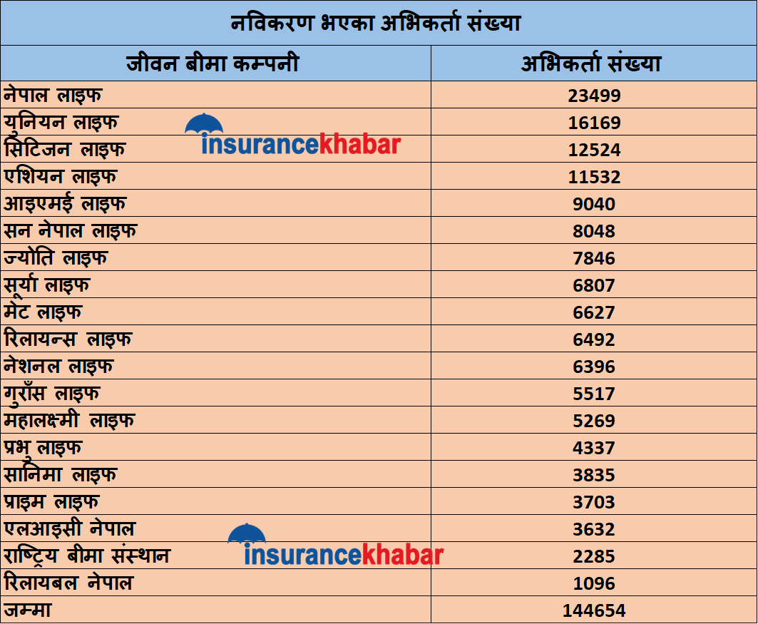 जीवन बीमा कम्पनीहरु मध्ये सर्वाधिक धेरै नेपाल लाइफ इन्स्योरेन्स कम्पनीका अभिकर्ताहरु रहेका छन् । नेपाल लाइफले २५ हजार ४७७ जना अभिकर्ताको विवरण अध्यावधिक गराएको छ । गएको चैत मसान्तका लागि नेपाल लाइफमा नविकरण गर्ने अभिकर्ताको संख्या २३ हजार ४९९ जना थिए । अव यस वर्षका लागि नविकरण गर्ने अभिकर्ता केवल २५ हजार ४७७ जना मात्रै रहनेछन् ।