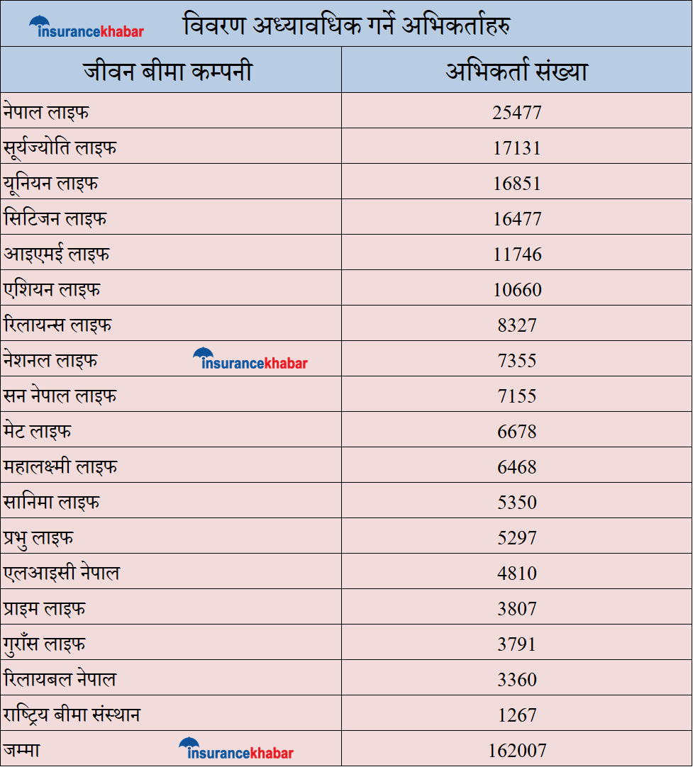 अन्य कम्पनीहरु क्रमश रिलायन्स लाइफको ८ हजार ३२७ जना, नेशनल लाइफ ७ हजार ३५५ जना, सन नेपाल लाइफ ७ हजार १६६ जना, मेट लाइफ ६ हजार ६७८ जना, महालक्ष्मी लाइफ ६ हजार ४६८ जना, सानिमा लाइफ ५ हजार ३५० जना, प्रभु लाइफ ५ हजार २९७ जना, एलआइसी नेपाल ४ हजार ८१० जना, प्राइम लाइफ ३ हजार ८०७ जना, गुराँस लाइफ ३ हजार ७९१ जना, रिलायबल नेपाल ३ हजार ३६० जना र राष्ट्रिय बीमा संस्थाले एक हजार २६७ जनाको विवरण अध्यावधिक गराएको छ ।