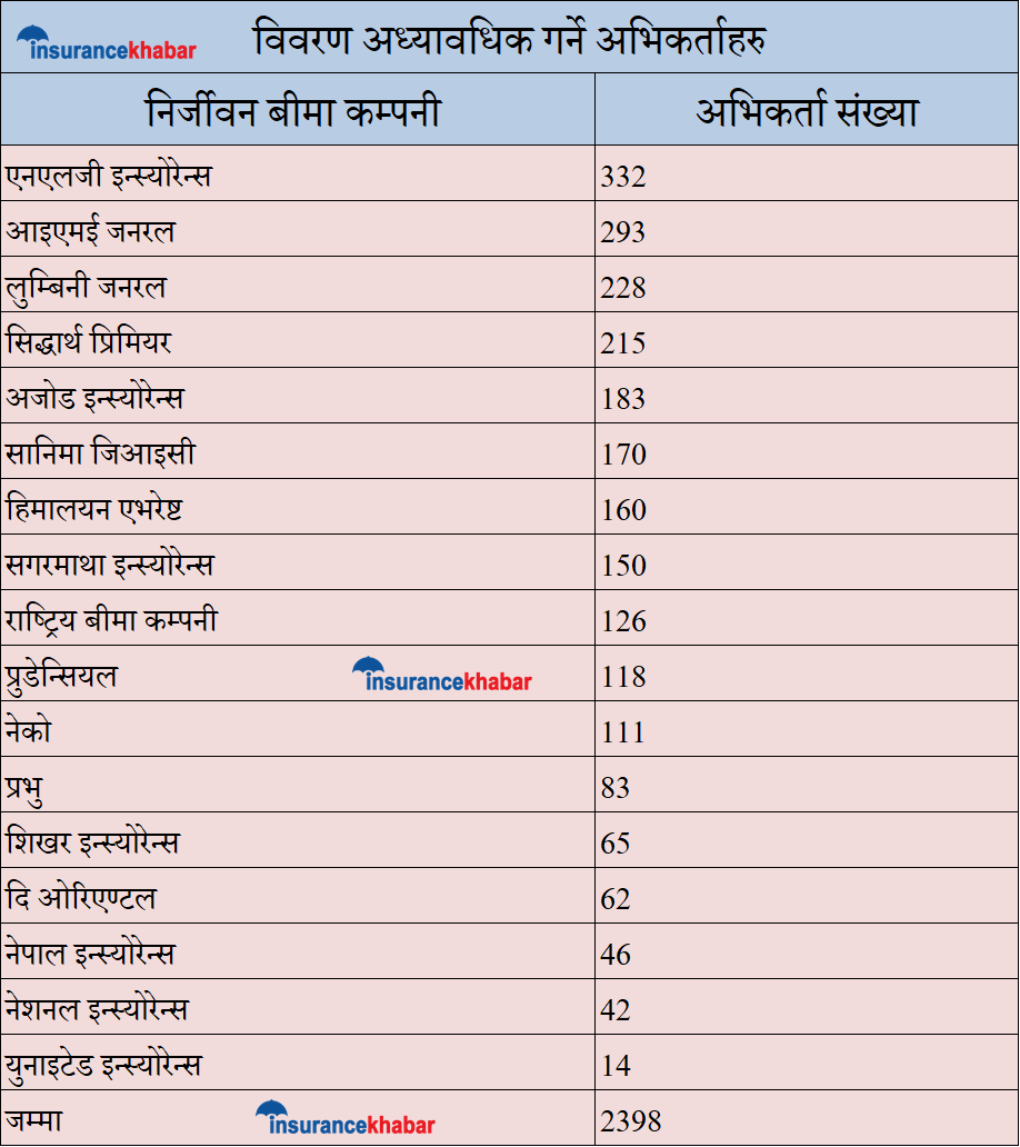 निर्जीवन बीमा कम्पनीहरु तर्फ पनि २ हजार ३९८ जना अभिकर्ताको विवरण अध्यावधिक भएको छ । निर्जीवन तर्फ सबैभन्दा ठुलो अभिकर्ताको सञ्जाल एनएलजी इन्स्योरेन्स कम्पनीको रहेको छ । कम्पनीले ३३२ जना को विवरण अध्यावधिक गराएको छ । त्यस्तै दोस्रो धेरै आइएमई जनरलले २९३ जना, तेस्रो धेरै लुम्बिनी जनरलले २२८ जना, चौधो धेरै सिद्धार्थ प्रिमियरले २१५ जनाको विवरण अध्यावधिक गराएको छ । अन्य कम्पनीहरु क्रमश अजोड इन्स्योरेन्स १८३, सानिमा जिआइसी १७०, हिमालयन एभरेष्ट १६०, सगरमाथा इन्स्योरेन्स १५०, राष्ट्रिय बीमा कम्पनी १२६, प्रुडेन्सियल ११८, नेको १११, प्रभु ८३, शिखर इन्स्योरेन्स ६५, दि ओरिएण्टल ६२, नेपाल इन्स्योरेन्स ४६, नेशनल इन्स्योरेन्स ४२ र युनाइटेड इन्स्योरेन्सले १४ जनाको विवरण अध्यावधिक गराएको छ ।