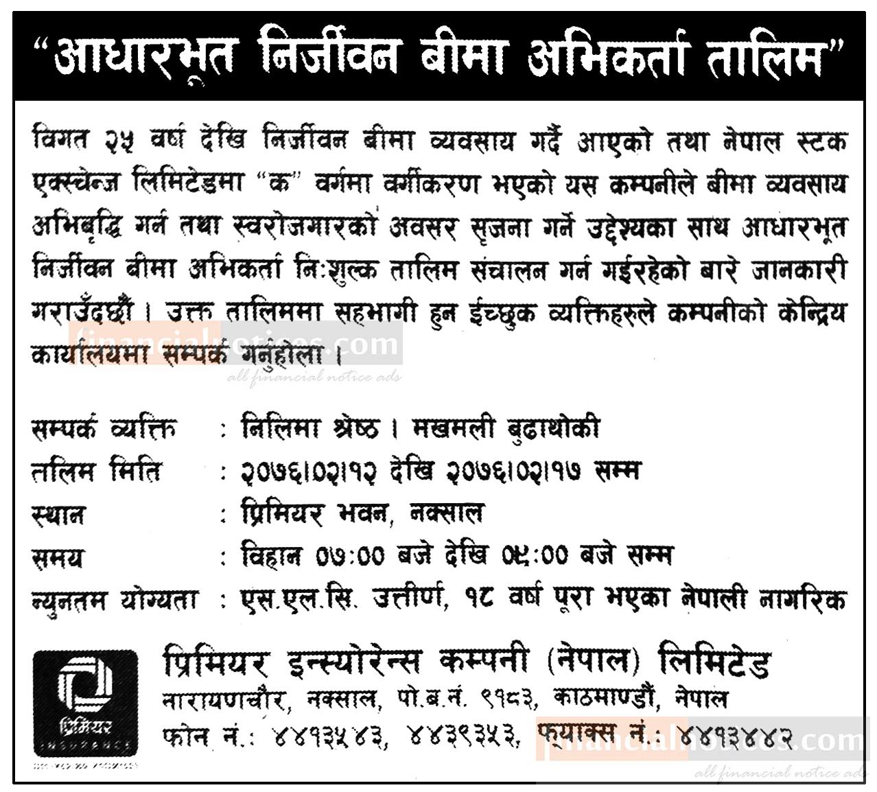 प्रिमियर इन्स्योरेन्स कम्पनीले अभिकर्ता तालिम सुरु गर्ने भएको छ । कम्पनीले जेठ १२ देखि १७ गतेसम्म अभिकर्ता तालिम सञ्चालन गर्न लागेको हो । विहान ७ बजे देखि ९बजेसम्म तालिम सञ्चालन गरिने कम्पनीले बताएको छ ।