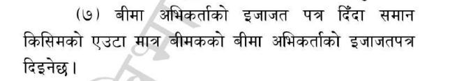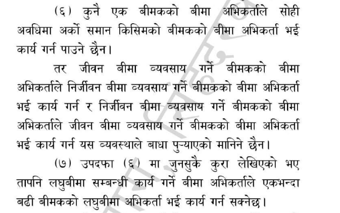 बीमा ऐनकाे दफा ९१(७) मा समान किसिमकाे व्यवसाय गर्ने एकभन्दा बढी बीमा कम्पनीकाे अभिकर्ता भई काम गर्न राेक लगाउने प्रावधान लघु बीमा बाहेककाे व्यवसाय गर्ने बीमककाे हकमा मात्र लागू गरिएकाे छ।