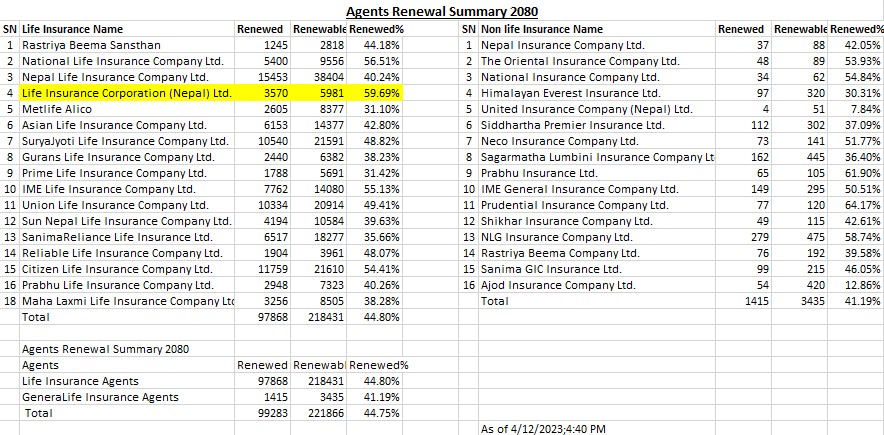 हालसम्म सबैभन्दा धेरै एलआइसी नेपालले ५९ प्रतिशत अर्थात ३ हजार ५७० अभिकर्ताको नविकरण गराएका छन् । साथै नेशनल लाइफका ५६ दशमलव ५१ प्रतिशत अर्थात ५ हजार ४०० अभिकर्ताले नविकरण गरेका छन् । आइएमई लाइफका ५५ दशमलब १३ प्रतिशत अर्थात ७ हजार ७६२ अभिकर्ताले नविकरण गरेका छन् । सिटिजन लाइफले ५४ दशमलव ४१ प्रतिशत अर्थात ११ हजार ७५९ जना अभिकर्ताको नविकरण गरिसकेको छ भने कम्पनीमा कुल २१ हजार ६१० जना अभिकर्ता सक्रिय छन् ।