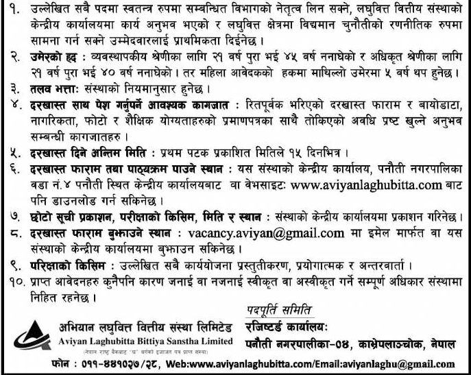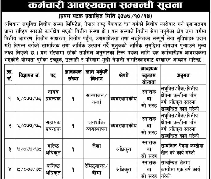 काठमाडौं । अभियान लघुवित्त वित्तीय संस्थाले विभिन्न पदका लागि कर्मचारीको माग गरेको छ । लघुवित्तले १ जना नायव प्रबन्धक, १ जना सहायक प्रबन्धक , १ जना बरिष्ठ अधिकृत, र १ जना जना कनिष्ठ अधिकृतका लागि कर्मचारीको माग गरेको जनाएको छ ।