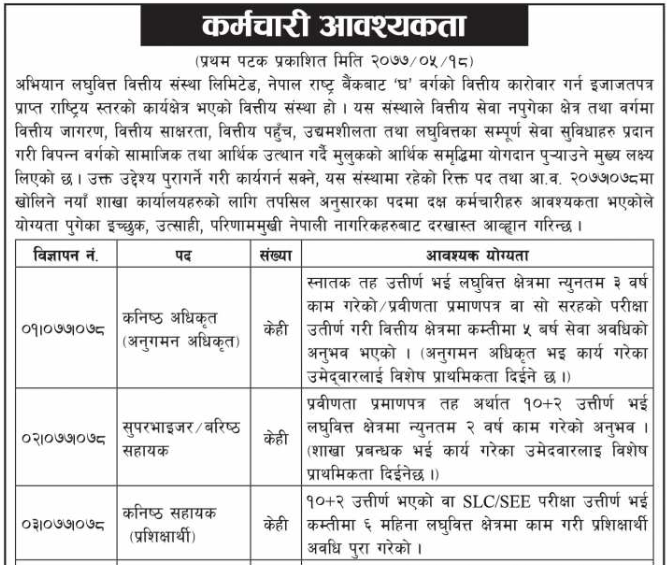 काठमाडौं । अभियान लघुवित्तले कर्मचारी माग गरेको छ । कम्पनीले विभिन्न ४ पदका लागि कर्मचारीको माग गरेको जनाएको छ । कम्पनीले अनुगमन अधिकृतका लागि केही, बरिष्ट सहायकका लागि केही, कनिष्ट सहायकका लागि केही र सवारी चालक एक जना माग गरेको हो ।