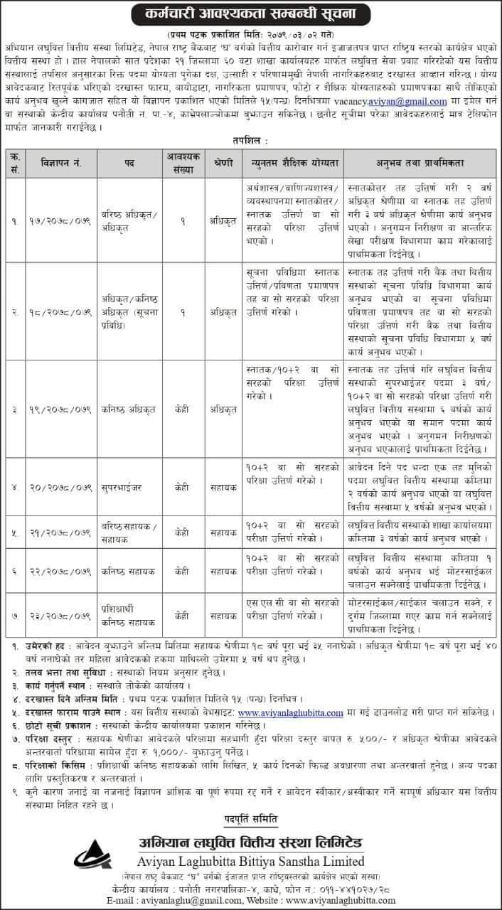 काठमाडौं । अभियान लघुवित्त वित्तीय संस्थाले विभिन्न पदका लागि कर्मचारीको माग गरेको छ । कम्पनीले वरिष्ठ अधिकृतका लागि १ जना, अधिकृत,कनिष्ठ अधिकृत(सुचना प्रविधि)का लागि १ जना, कनिष्ठ अधिकृतका लागि केही, सुपरभाइजरका लागि केही, वरिष्ठ सहायकका लागि केही, कनिष्ठ सहायकका लागि केही, प्रशिक्षर्थीका लागि केही संख्यामा कर्मचारीको माग गरेको हो ।