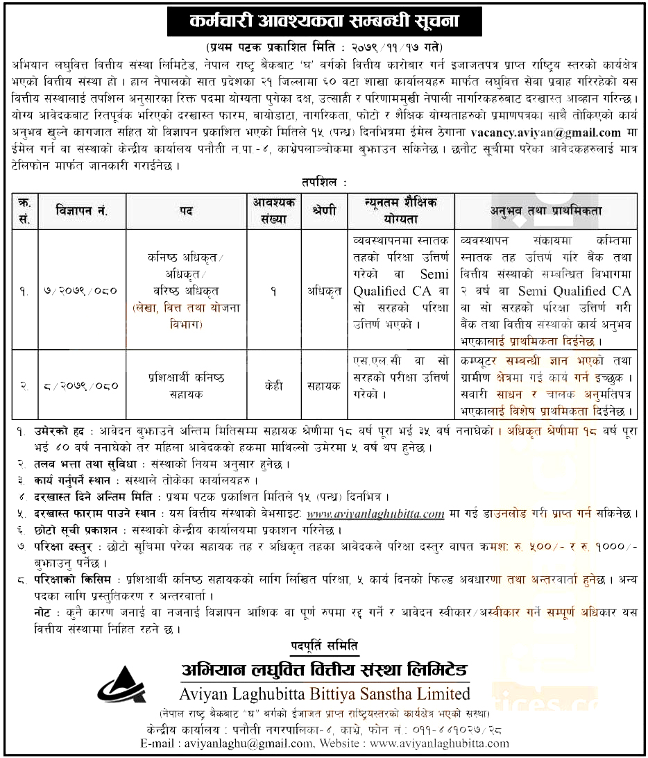 काठमाडौं । अभियान लघुवित्त वित्तिय संस्था लिमिटेडले विभिन्न पदका लागि कर्मचारी माग गरेको छ । संस्थाले लेखा, वित्त तथा योजना विभाग अन्तर्गत कनिष्ठ अधिकृत पदमा १ जना र प्रशिक्षार्थि कनिष्ठ सहायक पदमा केहि संख्याका लागि कर्मचारी माग गरेको हो । उक्त पदहरुमा आवेदन दिनको लागि मान्यता प्राप्त शैक्षिक संस्थाबाट प्लस टु देखि स्नात्तक तह उत्तिर्ण गरेको हुुनुुपर्ने जनाएको छ । ईच्छुक तथा योग्यता उम्मेदवारले सुचना प्रकाशित भएको मितिले १५ दिनभित्र आवेदन दिन सक्नेछन् ।