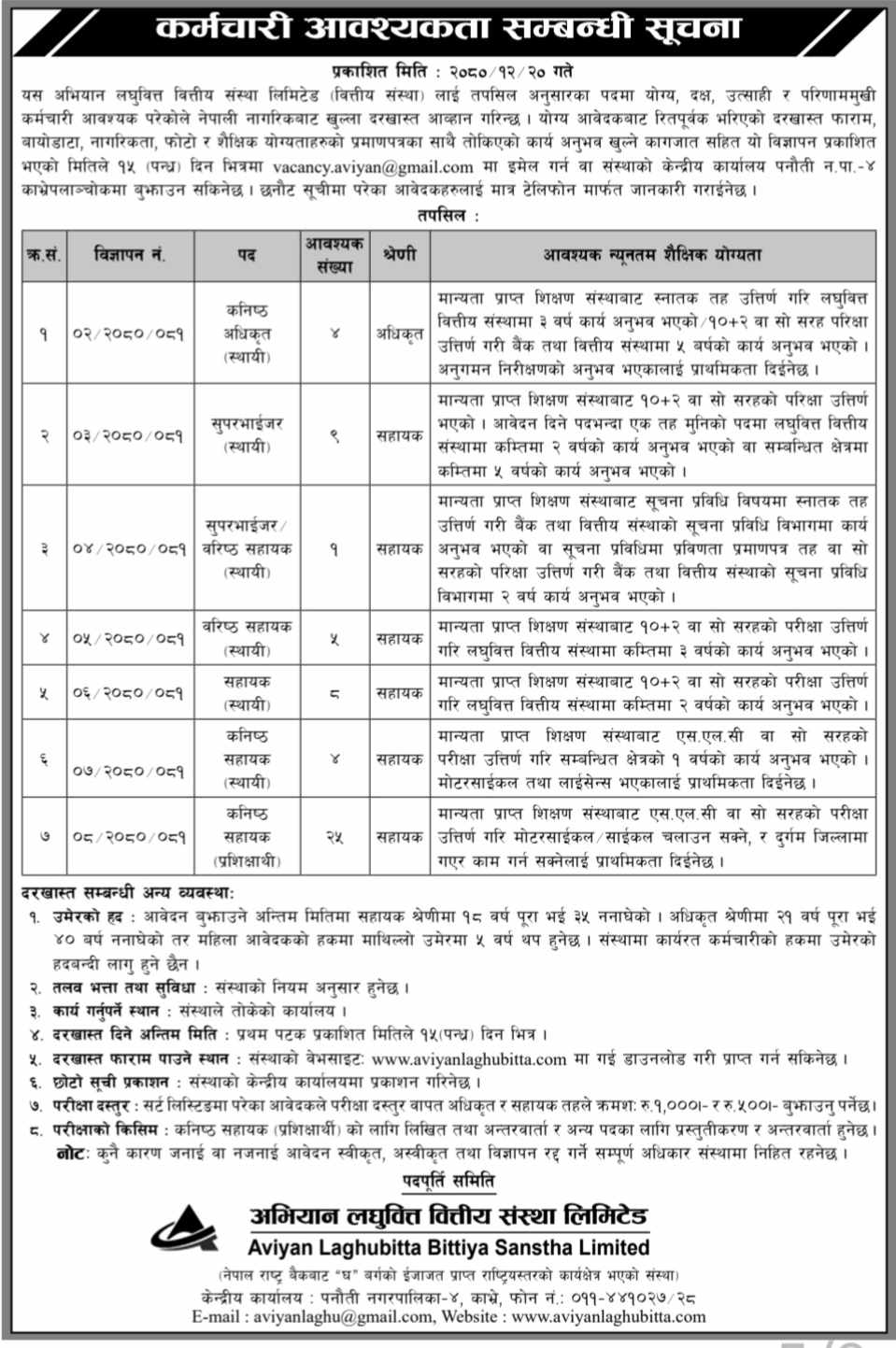लघुवित्तले कनिष्ठ अधिकृतका लागि ४ जना, सुपरभाईजरका लागि ९ जना, सुपरभाईजर–वरिष्ठ सहायकका लागि १ जना, वरिष्ठ सहायकका लागि ५ जना, सहायकका लागि ८ जना, कनिष्ठ सहायक पदका लागि ४ जना र कनिष्ठ सहायक प्रशिक्षार्थीमा २५ जना गरी कूल ५६ जना कर्मचारी माग गरेको हो ।