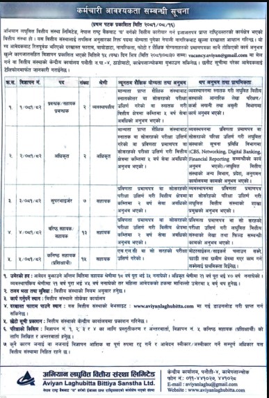 संस्थाले आफ्नो केन्द्रीय कमार्यालय तथा विभिन्न शाखा कार्यालयका लागि कर्मचारी माग गरेको हो । ईच्छुक तथा योग्यता पुगेका व्यक्तिले आफ्नो बायोडाटा, शैक्षिक प्रमाणपत्र तथा नागरिकता लगायतका आवश्यक कागजात सहित सूचना प्रकाशित भएको मितिले १५ दिनभित्र कम्पनीको इमेल ठेगाना,अनलाईन वा कम्पनीको केन्द्रीय कार्यालयमै उपस्थित भएर आवेदन दिन सकिने जनाइएको छ ।