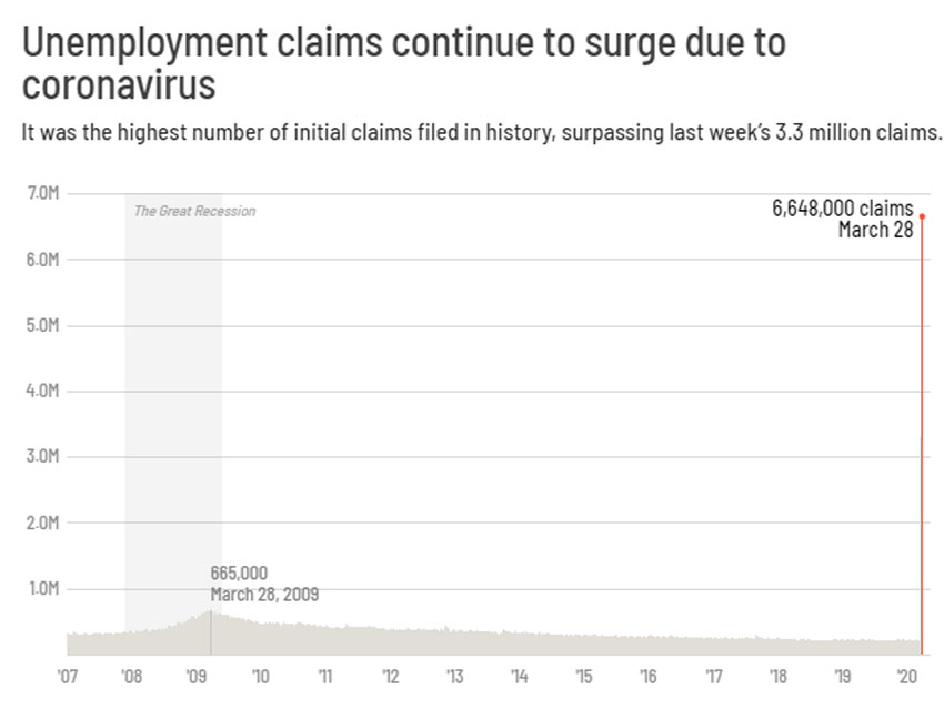 अमेरिकी समाचार संस्था सिएनएनका अनुसार अमेरिकामा मार्चको अन्तिम सातासम्म ६६ लाख ४८ हजार जनाले बेरोजगार भएको भन्दै सरकारी अनुदान माग गर्दै आवेदन भरेका छन् । तथ्याङ्क अनुसार अमेरिकामा यो साता बेरोजगारी दर १० प्रतिशतले बृद्धि भएको छ । अमेरिकामा तलबको हिसाव–किताव प्रत्येक हप्ता हुने गर्दछ । हरेक साता तलब बुझ्ने अमेरिकीहरु गत साता ठूलो संख्यामा बेरोजगार भएको भन्दै बेरोजगार भत्ता माग गरेका छन् । अमेरिकामा राज्य अनुसार बेरोजगार फरक फरक भएपनि सामान्यतया प्रतिहप्ता ४५० डलर बेरोजगार भत्ता पाइन्छ ।