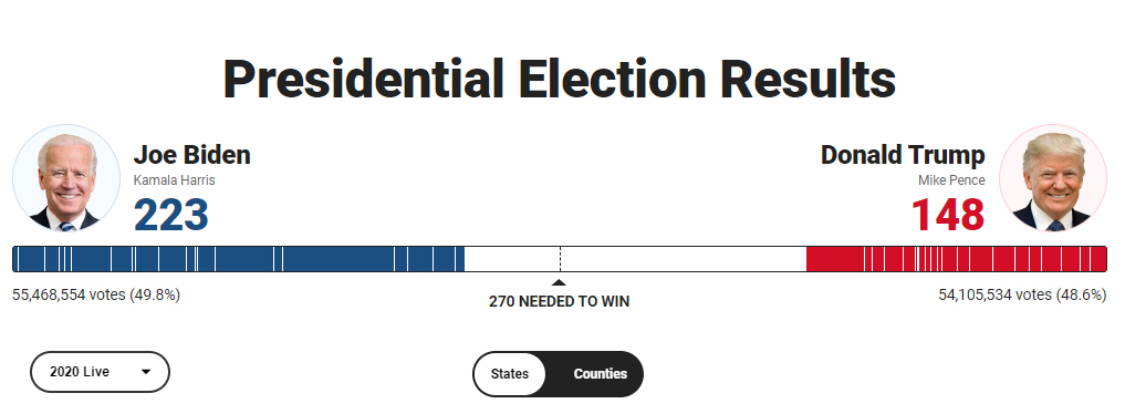 अमेरिकी निर्वाचनको मत परिणाम अबको केही घण्टामा घोषणा हुनेछ । राष्ट्रपतिको निर्वाचनमा कडा टक्कर देखिएकोे छ । राष्ट्रपतिको निर्वाचनमा सबैभन्दा धेरै मत भएका क्षेत्रहरु ५५ भोट रहेको क्यालिफोर्नियामा जोई बाईडेन बिजयी भएका छन् भने ३८ भोट भएको टेक्सास ३६ सिट भएको फ्लोरिडामा डोनाल्ड ट्रम्पले अग्रता लिएका छन् । यसअघि ट्रम्पले जितेको न्यूयोर्कमा बाईडेनले जितेका छन् भने २० भोट रहेको पेन्सिलभानियामा ट्रम्पले नै अग्रता लिएका छन् ।