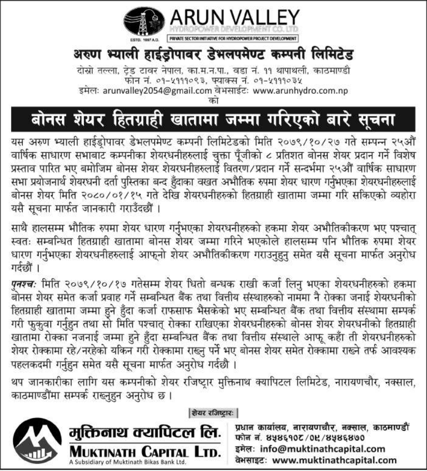 माघ १७ गतेसम्म शेयर बन्धक राखी कर्जा लिएका शेयरधनीहरूको हकमा बोनस शेयर सम्बन्धित बैंक तथा वित्तीय संस्थाको नाममा रोक्का जनाई हितग्राही खातामा जम्मा गरिएको जनाएको छ । कम्पनीको शेयर रजिष्ट्रारमा मक्तिनाथ क्यापिटल लिमिटेड रहेको छ ।