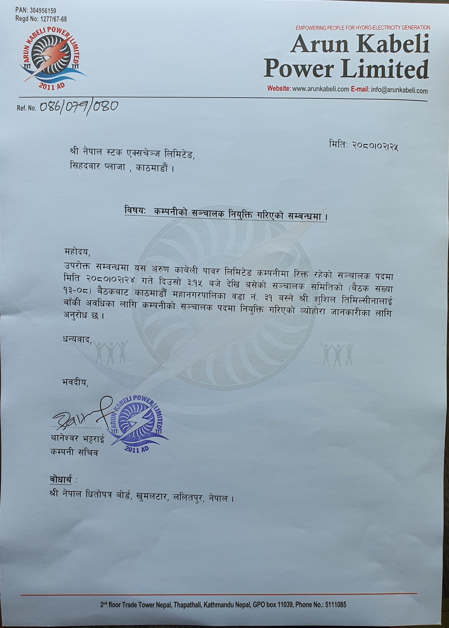 काठमाडौं । अरुण काबेली पावर लिमिटेडको संचालकमा शुशिल तिमिल्सीना नियुक्त भएका छन् । कम्पनीको जेठ २४ गते बसेको संचालक समितिको बैठकले रिक्त रहेको संचालक पदमा काठमाडौं महानगरपालिका वडा नं ३१ बस्ने तिमिल्सीनालाई बाँकी अवधिका लागि नियुक्त गरिएको कम्पनीले जनाएको छ ।