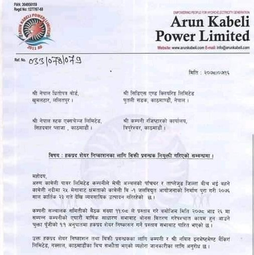 हकप्रद शेयर निष्काशनका लागि कम्पनी र नबिल इन्भेष्टमेण्ट बैंकिङ बीच सम्झौता भएको हो । कम्पनीले शतप्रतिशत अर्थात् १ः१ अनुपातमा हकप्रद शेयर निष्काशन गर्ने प्रस्ताव भदौ २६ गते सम्पन्न साधारण सभाबाट पारित गरेको थियो ।